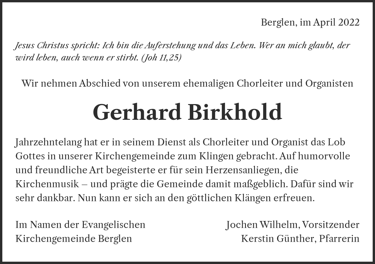 Jahrzehntelang hat er in seinem Dienst als Chorleiter und Organist das Lob Gottes in unserer Kirchengemeinde zum Klingen gebracht. Auf humorvolle und freundliche Art begeisterte er für sein Herzensanliegen, die Kirchenmusik – und prägte die Gemeinde damit maßgeblich. Dafür sind wir sehr dankbar. Nun kann er sich an den göttlichen Klängen erfreuen.