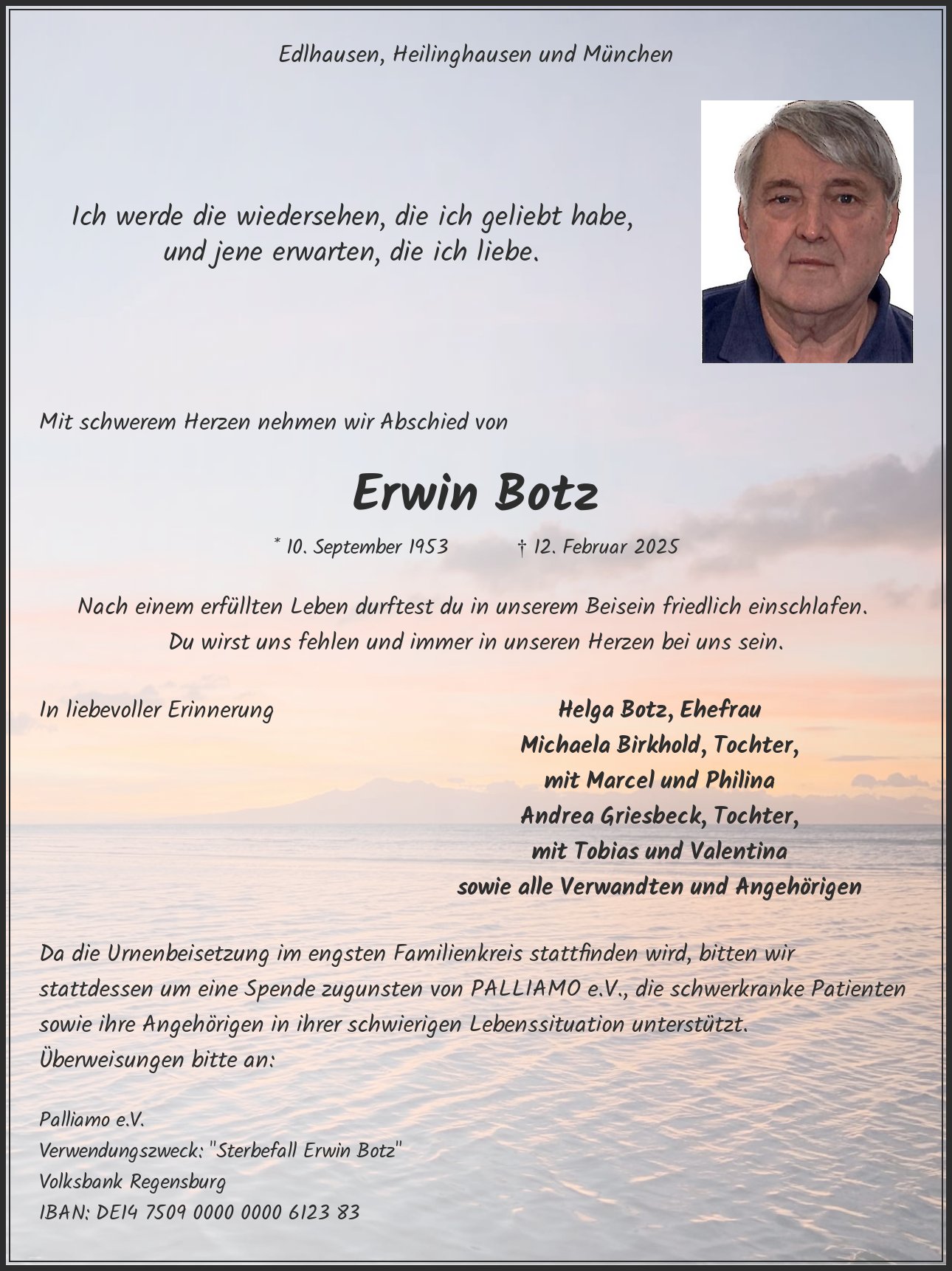Palliamo e.V. Verwendungszweck: "Sterbefall Erwin Botz" Volksbank Regensburg IBAN: DE14 7509 0000 0000 6123 83