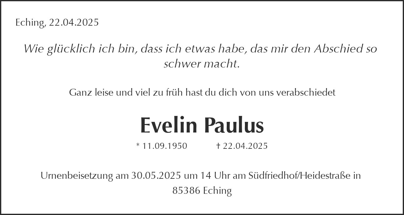 Urnenbeisetzung am 30.05.2025 um 14 Uhr am Südfriedhof/Heidestraße in 85386 Eching