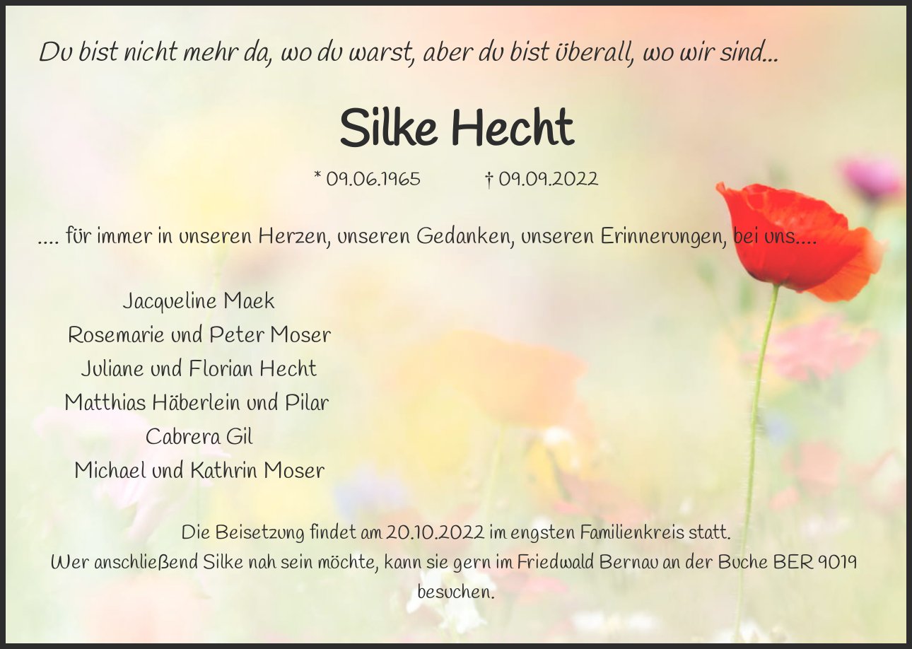 Die Beisetzung findet am 20.10.2022 im engsten Familienkreis statt. Wer anschließend Silke nah sein möchte, kann sie gern im Friedwald Bernau an der Buche BER 9019 besuchen.