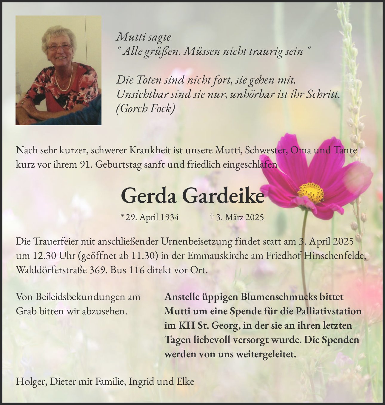 Die Trauerfeier mit anschließender Urnenbeisetzung findet statt am 3. April 2025 um 12.30 Uhr (geöffnet ab 11.30) in der Emmauskirche am Friedhof Hinschenfelde, Walddörferstraße 369. Bus 116 direkt vor Ort.