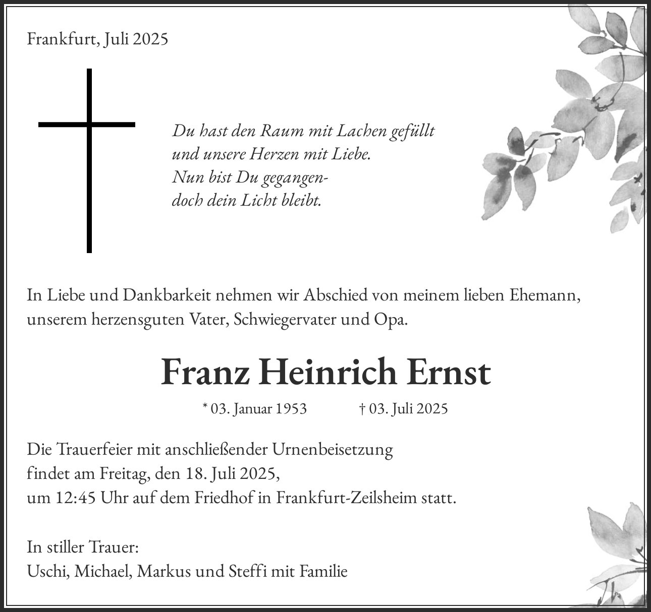 Die Trauerfeier mit anschließender Urnenbeisetzung findet am Freitag, den 18. Juli 2025, um 12:45 Uhr auf dem Friedhof in Frankfurt-Zeilsheim statt.