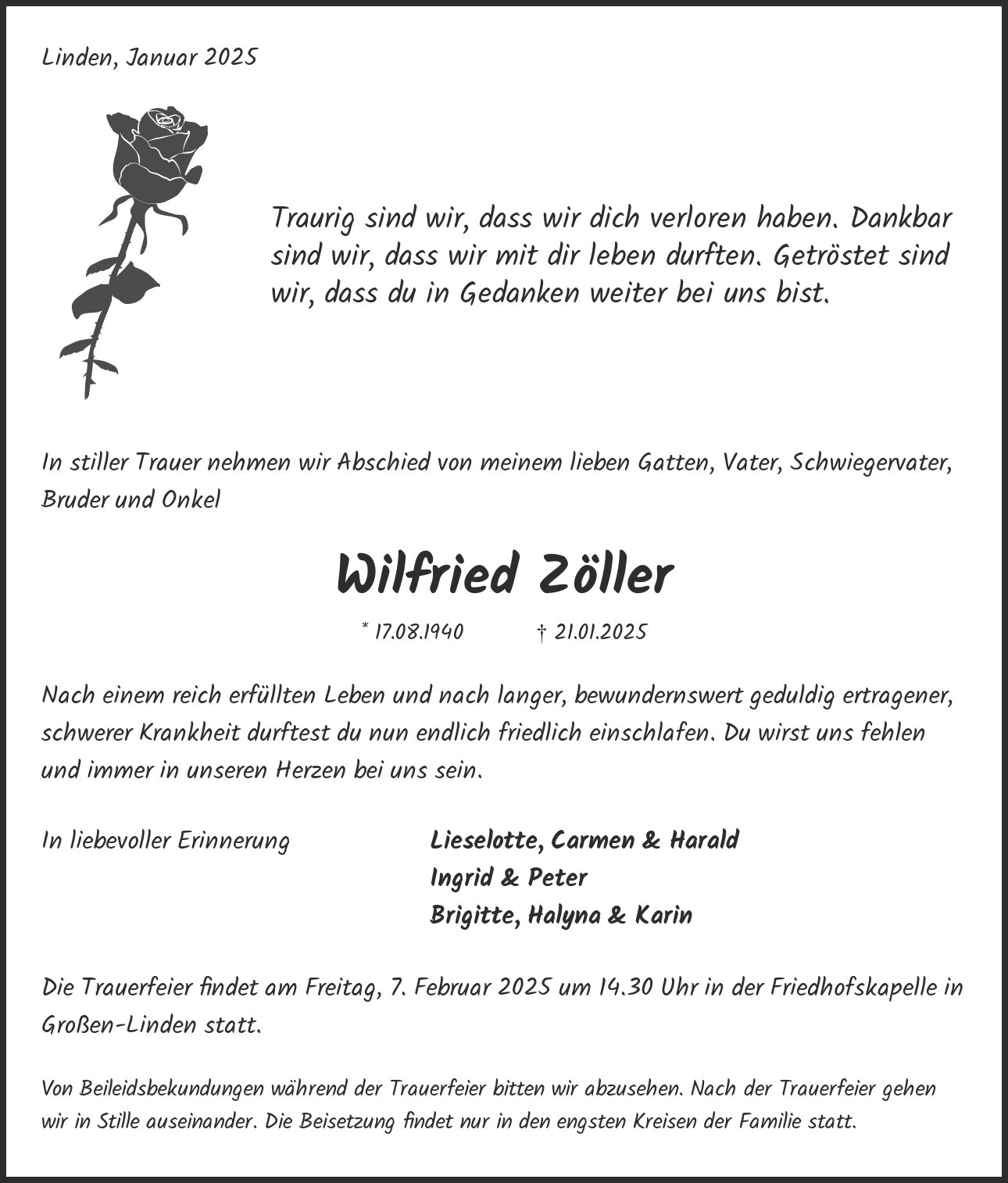 Die Trauerfeier findet am Freitag, 7. Februar 2025 um 14.30 Uhr in der Friedhofskapelle in Großen-Linden statt.