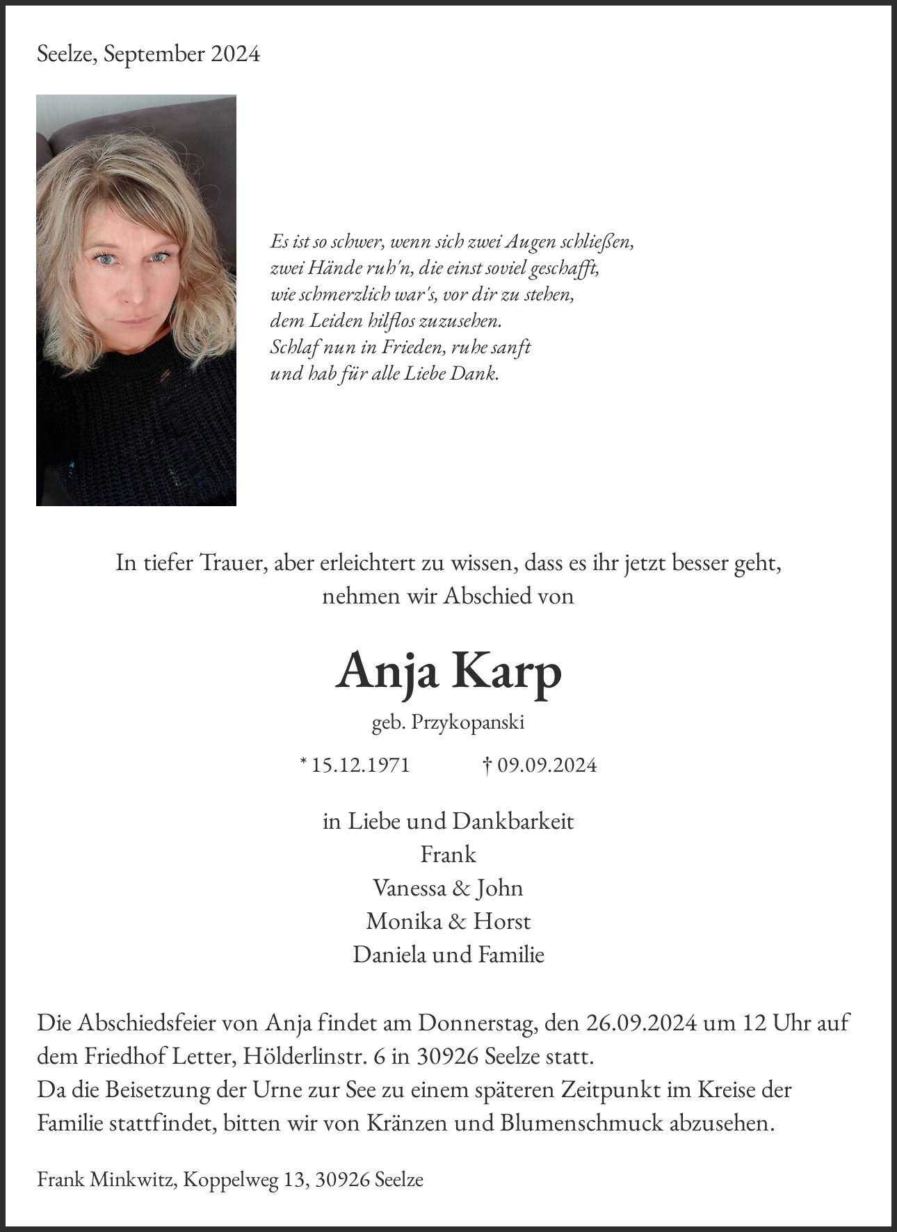 Die Abschiedsfeier von Anja findet am Donnerstag, den 26.09.2024 um 12 Uhr auf dem Friedhof Letter, Hölderlinstr. 6 in 30926 Seelze statt. Da die Beisetzung der Urne zur See zu einem späteren Zeitpunkt im Kreise der Familie stattfindet, bitten wir von Kränzen und Blumenschmuck abzusehen.