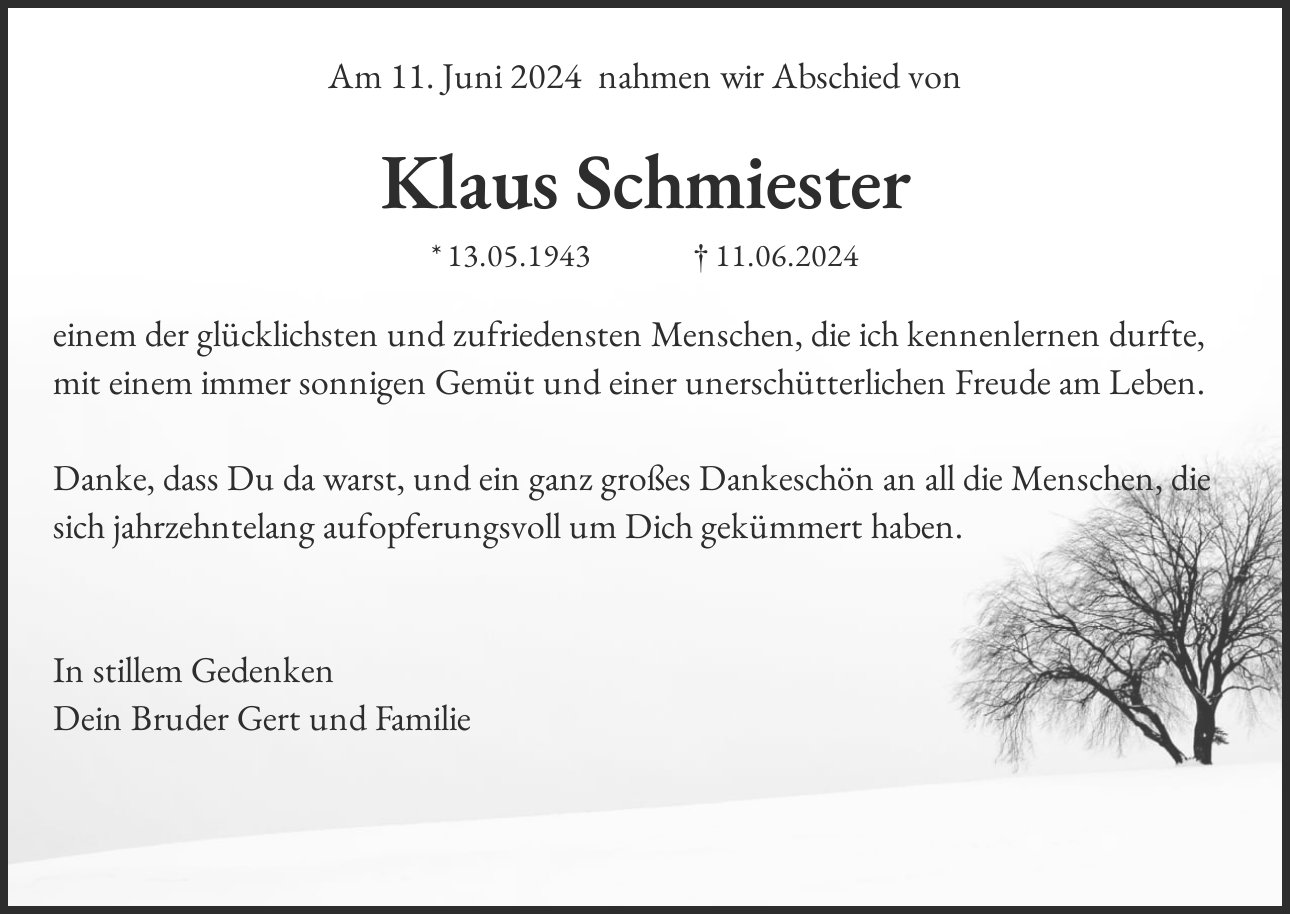 einem der glücklichsten und zufriedensten Menschen, die ich kennenlernen durfte, mit einem immer sonnigen Gemüt und einer unerschütterlichen Freude am Leben. Danke, dass Du da warst, und ein ganz großes Dankeschön an all die Menschen, die sich jahrzehntelang aufopferungsvoll um Dich gekümmert haben. In stillem Gedenken Dein Bruder Gert und Familie
