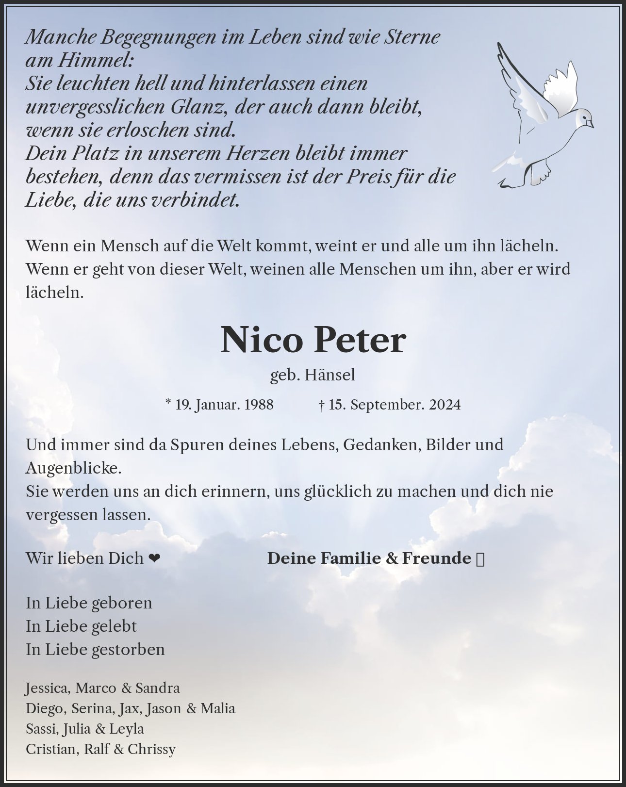Manche Begegnungen im Leben sind wie Sterne am Himmel: Sie leuchten hell und hinterlassen einen unvergesslichen Glanz, der auch dann bleibt, wenn sie erloschen sind. Dein Platz in unserem Herzen bleibt immer bestehen, denn das vermissen ist der Preis für die Liebe, die uns verbindet.