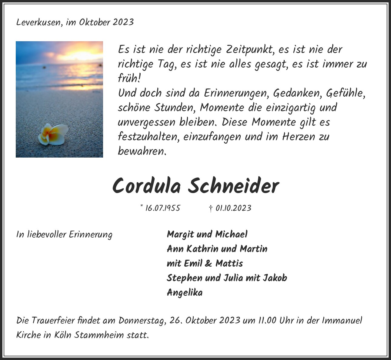 Die Trauerfeier findet am Donnerstag, 26. Oktober 2023 um 11.00 Uhr in der Immanuel Kirche in Köln Stammheim statt.