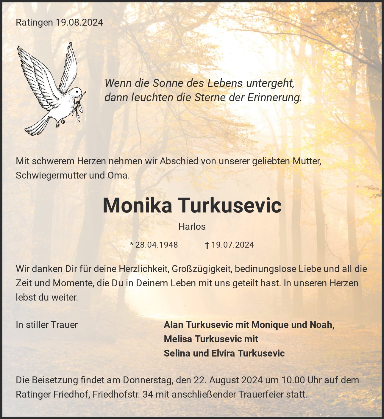 Die Beisetzung findet am Donnerstag, den 22. August 2024 um 10.00 Uhr auf dem Ratinger Friedhof, Friedhofstr. 34 mit anschließender Trauerfeier statt.