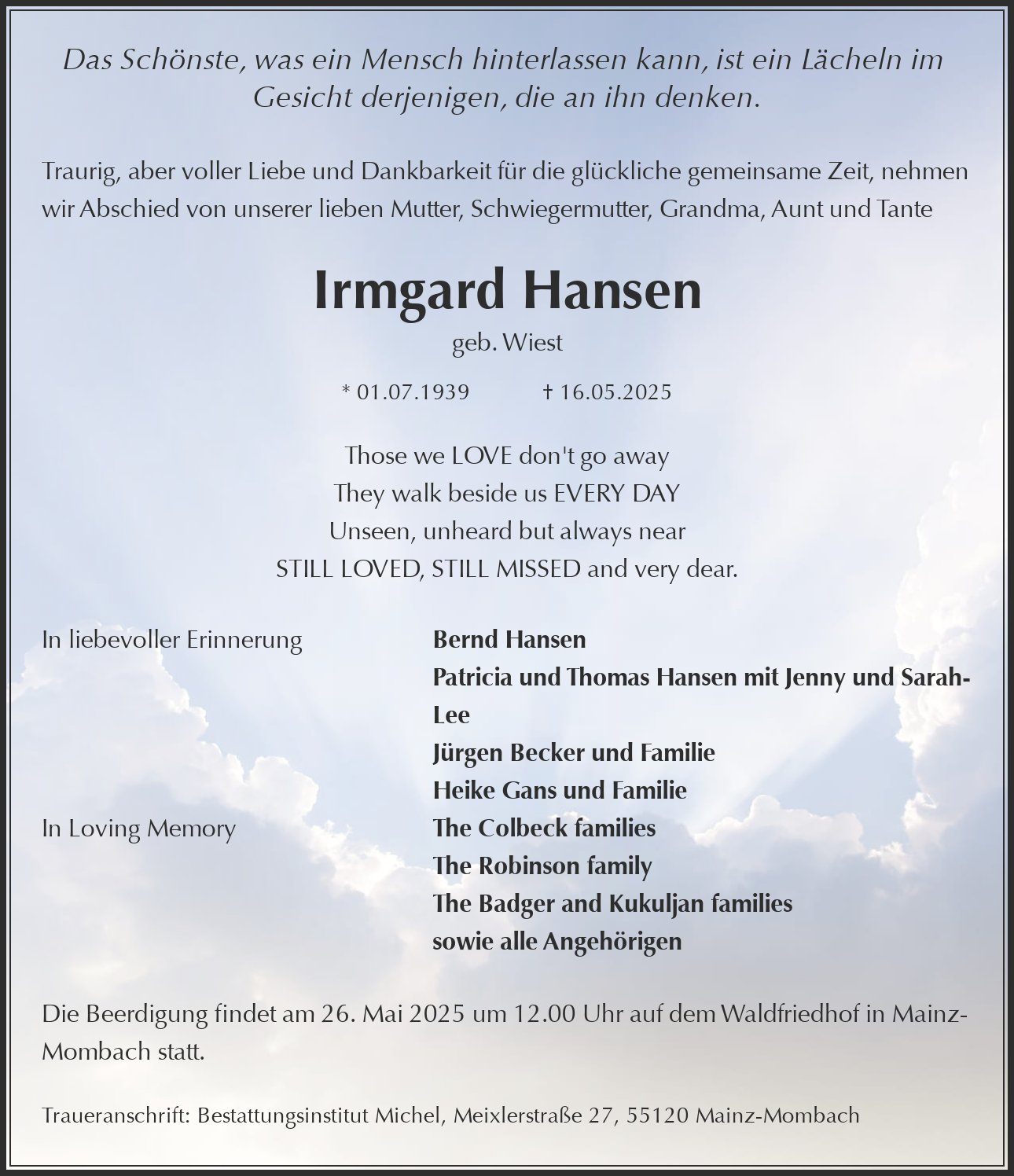 Die Beerdigung findet am 26. Mai 2025 um 12.00 Uhr auf dem Waldfriedhof in Mainz-Mombach statt.