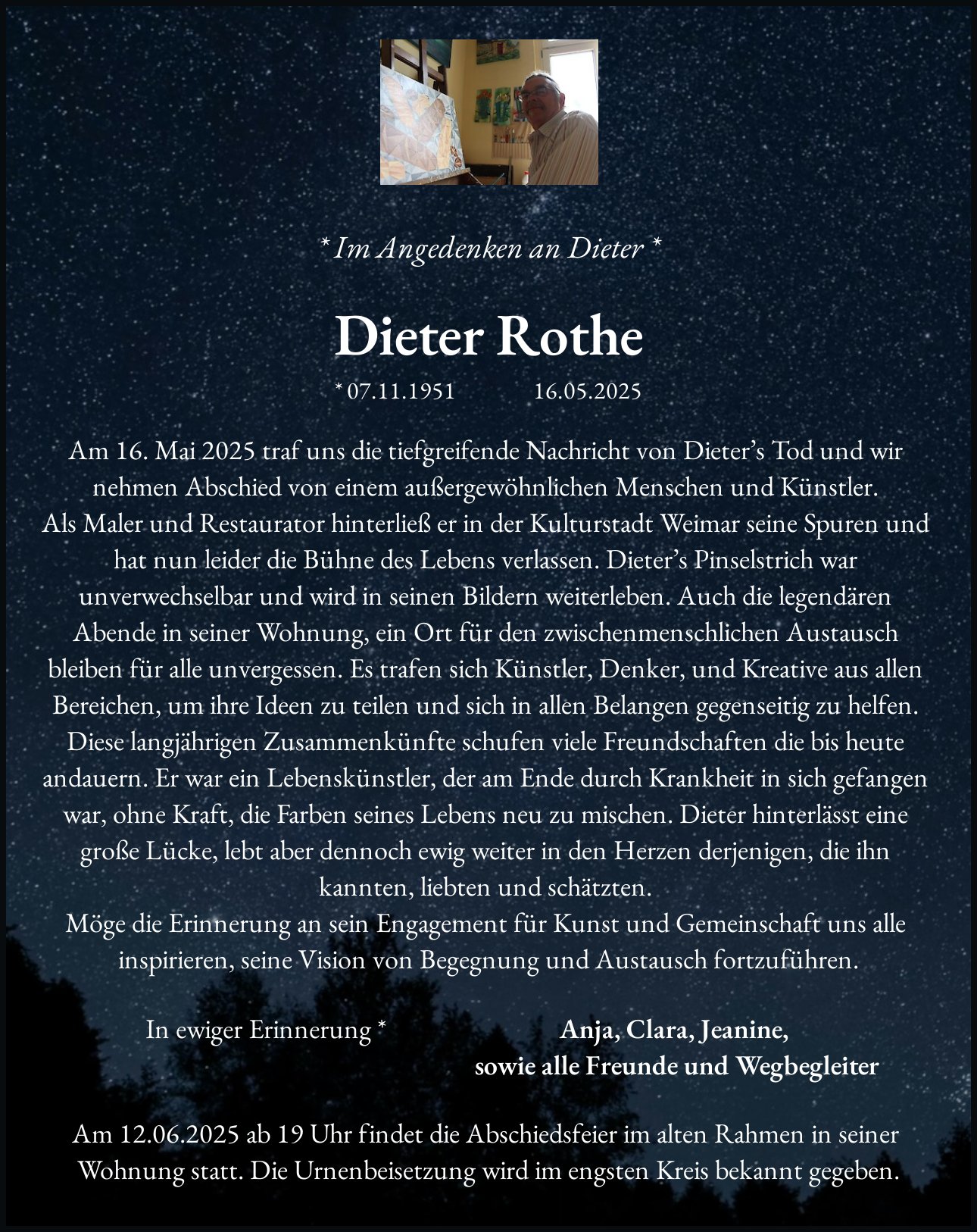 Am 16. Mai 2025 traf uns die tiefgreifende Nachricht von Dieter’s Tod und wir nehmen Abschied von einem außergewöhnlichen Menschen und Künstler. Als Maler und Restaurator hinterließ er in der Kulturstadt Weimar seine Spuren und hat nun leider die Bühne des Lebens verlassen. Dieter’s Pinselstrich war unverwechselbar und wird in seinen Bildern weiterleben. Auch die legendären Abende in seiner Wohnung, ein Ort für den zwischenmenschlichen Austausch bleiben für alle unvergessen. Es trafen sich Künstler, Denker, und Kreative aus allen Bereichen, um ihre Ideen zu teilen und sich in allen Belangen gegenseitig zu helfen. Diese langjährigen Zusammenkünfte schufen viele Freundschaften die bis heute andauern. Er war ein Lebenskünstler, der am Ende durch Krankheit in sich gefangen war, ohne Kraft, die Farben seines Lebens neu zu mischen. Dieter hinterlässt eine große Lücke, lebt aber dennoch ewig weiter in den Herzen derjenigen, die ihn kannten, liebten und schätzten. Möge die Erinnerung an sein Engagement für Kunst und Gemeinschaft uns alle inspirieren, seine Vision von Begegnung und Austausch fortzuführen.