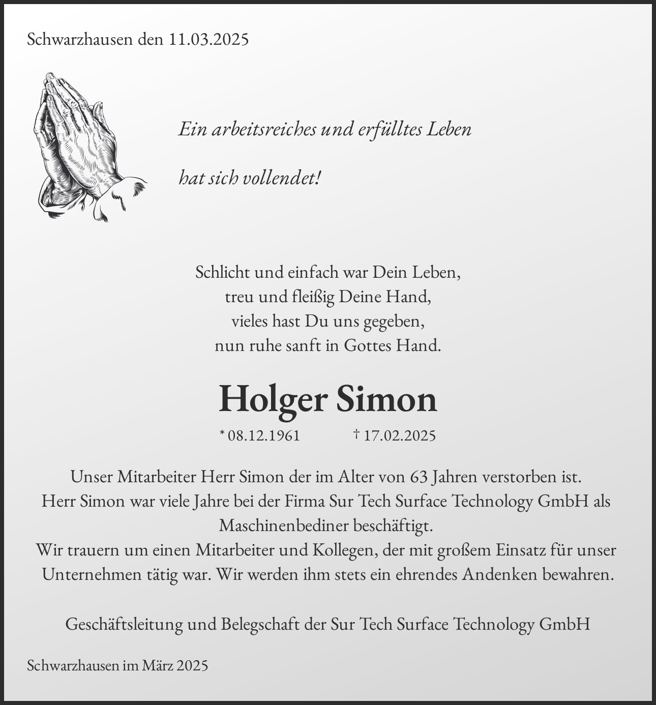 Unser Mitarbeiter Herr Simon der im Alter von 63 Jahren verstorben ist. Herr Simon war viele Jahre bei der Firma Sur Tech Surface Technology GmbH als Maschinenbediner beschäftigt. Wir trauern um einen Mitarbeiter und Kollegen, der mit großem Einsatz für unser Unternehmen tätig war. Wir werden ihm stets ein ehrendes Andenken bewahren.