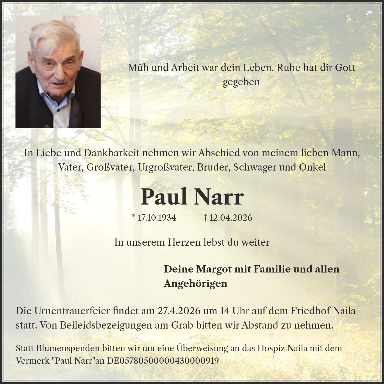 Statt Blumenspenden bitten wir um eine Überweisung an das Hospiz Naila mit dem Vermerk "Paul Narr"an DE05780500000430000919
