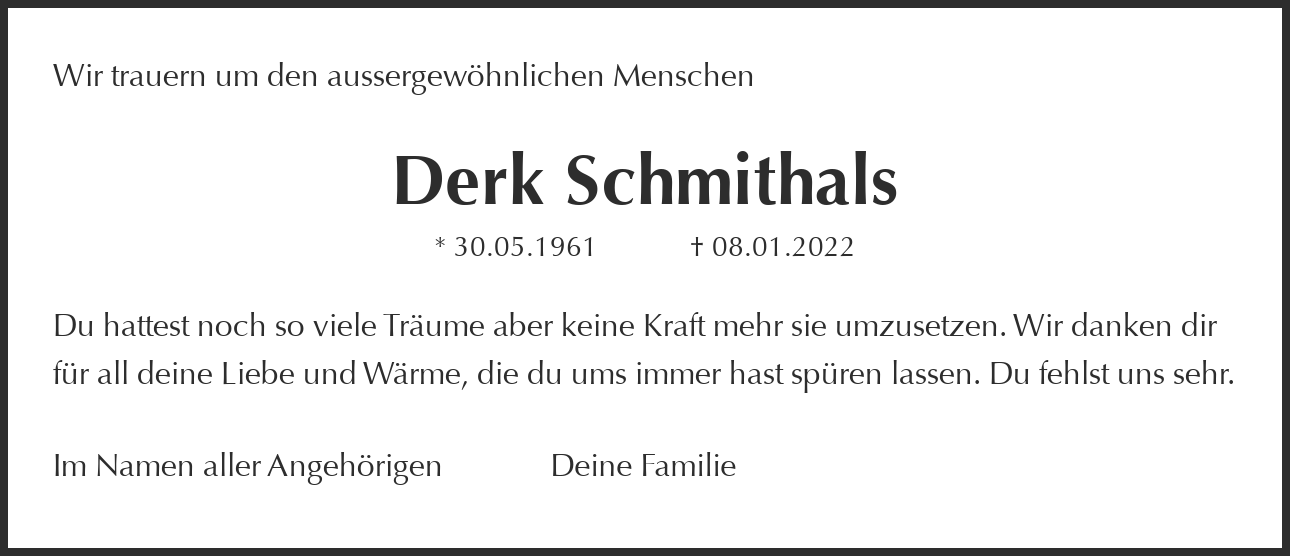 Du hattest noch so viele Träume aber keine Kraft mehr sie umzusetzen. Wir danken dir für all deine Liebe und Wärme, die du ums immer hast spüren lassen. Du fehlst uns sehr.