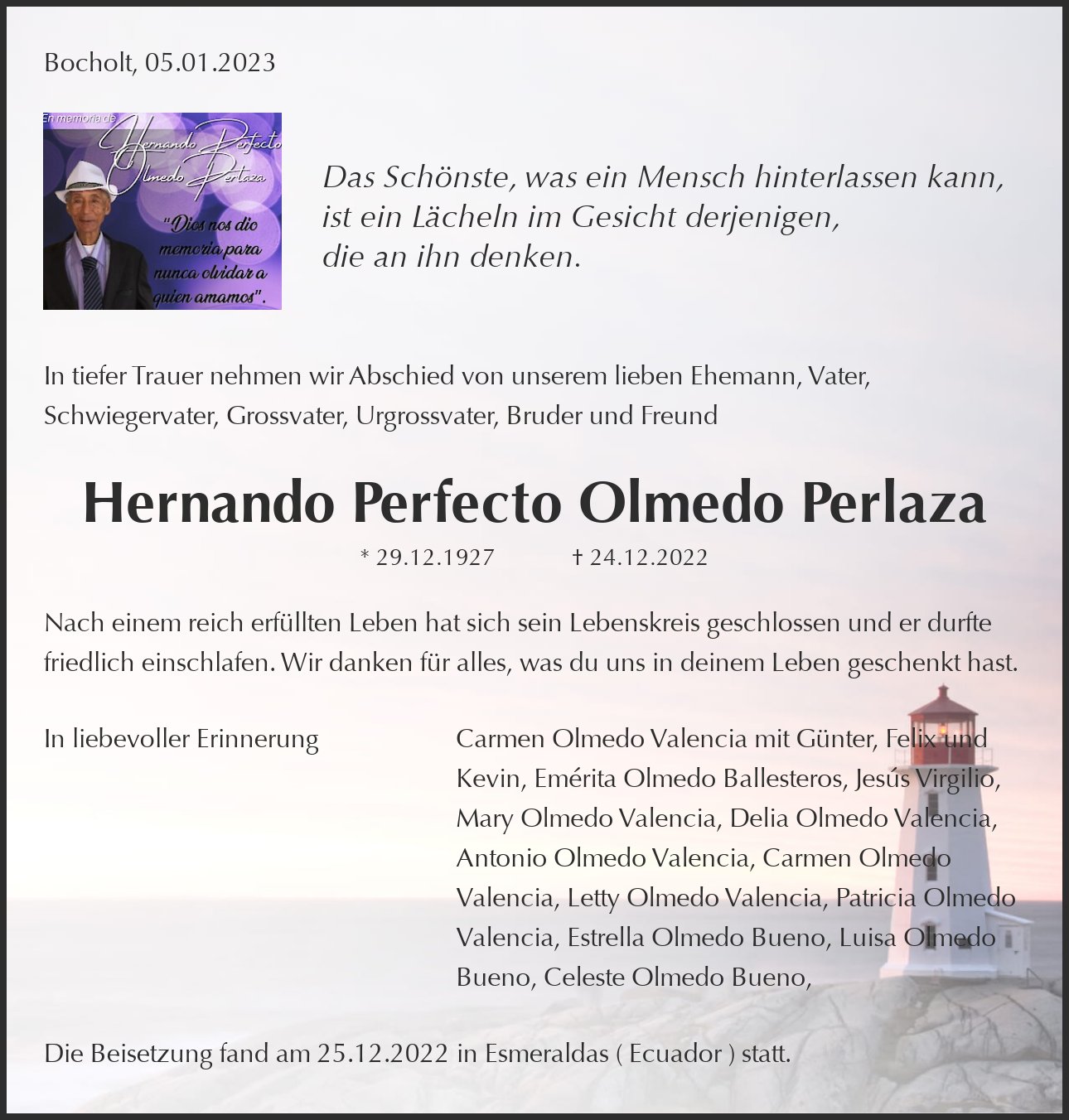 Die Beisetzung fand am 25.12.2022 in Esmeraldas ( Ecuador ) statt.